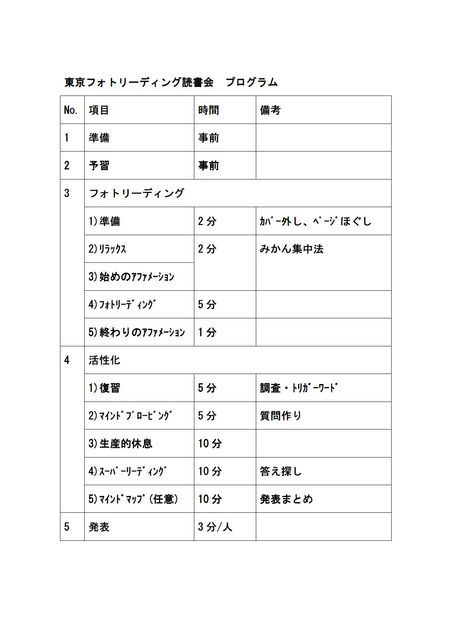 【前回の読書会】 http://mixi.jp/view_bbs.pl?id=50734742&comm_id=4713742 この度、第2回読書会を企画しましたのでご連絡します。 不慣れな点もあるかと思いますが、 みなさんのご参加をお待ちしております。 1.日時 2010年5月9日(土) 15:00(読書会は18:00頃終了予定) *JR神田駅 北口・東口改札出口集合 2.場所 神田駅周辺のカフェ (VELOCE神田鍛治町三丁目店または神田駅北口店の予定) 3.費用 無料(飲食代のみ) 4.内容 1)フォトリーディング一式(添付) *準備、予習は事前に