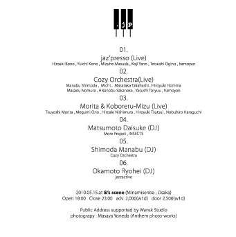 書き込み失礼します。 メルソルリーダー西村氏参加の 新バンドが出演します。 MCに下ネタは無いかもしれませんが、 代わりに自分がMCで頑張ります。。。 嘘です。 是非! -------------------------- "Direction Of Thousand Jazz Passion" の頭文字をとって"dot jp" 「無数のジャズが持つ情熱の向かう先」 敷居が高いと思われがちのジャズを幅広い解釈で、 そして何より「生の演奏」を手を伸ばせば届く位置で、 音を"情熱"として感じれる場所。 そして音楽に精通した「選曲家」であるDJが 心,体を踊らせるサウン