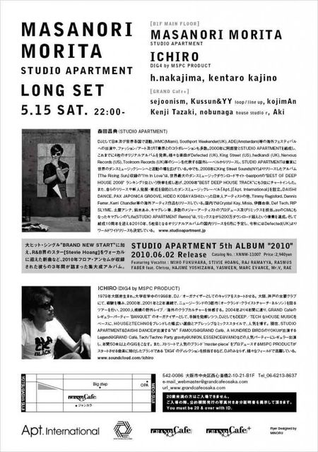6月2日にSTUDIO APARTMENTとして3年振りとなる5th ALBUM「2010」をリリースする森田昌典がグランカフェでは久々となるロングセットを披露する。当日はNEW ALBUM「2010」に収録される、数々の未発表曲をリリース前に聴けるまたとない機会であり、レギュラーパーティー"W" FAMOUSとはまた違った顔を今回は見せてくれるに違いない。ファン待望の一夜となる。 http://grandcafeosaka.com/venue/flyer/58457 ■DATE■ 2010.05.15(SAT) ■TITLE■ MASANORI MORITA(STUDIO APARTMENT) LONG SET ■DJ■ MASANORI MORITA(STUDIO APARTMENT