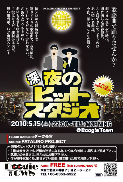 管理人様告知失礼します。 5月15日(土曜日)大阪・天六@Boogie Townでは2ヶ月に1度の歌謡曲ナイトです!! 懐メロから最新曲まで選りすぐりの歌謡曲で一夜を演出。 踊りに、笑いに、是非遊びに来てくださいませ。 今回ももちろん入場無料!!!!!! Pataliro-Project Presents 『 深夜のヒットスタジオ vol.4 』 SOUND / PATALIRO-PROJECT&FRIENDS… FLOOR DANCER/ ダーク長官 2010.5.15 土曜日 場所:Boogie Town 大阪市天神橋7-2-2F (天神橋6丁目交差点近くのやよい軒の2階です
