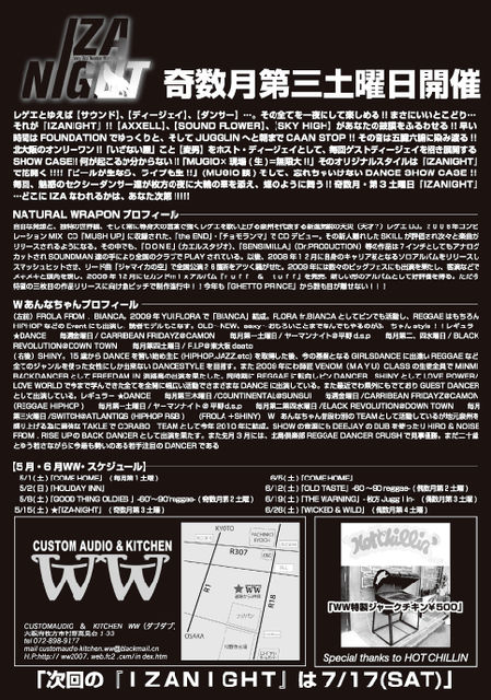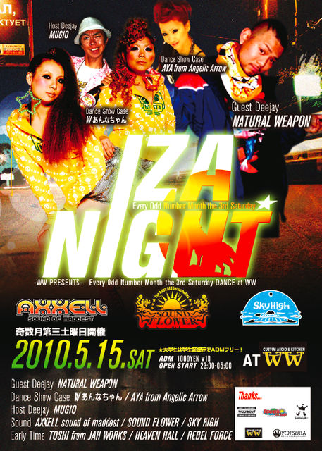 管理人様、告知失礼します。 5/15(Sat) 【IZANIGHT】 ■Guest Deejay:NATURAL WEAPON(Happy Birth Day) ■Dance Show Case:Wあんなちゃん / AYA from Angelic Arrow ■Host Deejay:MUGIO ■Sound:AXXELL sound of maddest / SOUND FLOWER / SKY HIGH ■Early Time:TOSHI from JAH WORKS / HEAVEN HALL / REBEL FORCE ■ADM : \1000w1D *学生は学生証提示でADMフリー!!!!! ■OPEN/START : 23:00 - Till Morning 2009.1月より奇数月第3土曜日に始まったこのダンス!! サウンドはもちろんのこと、ディー