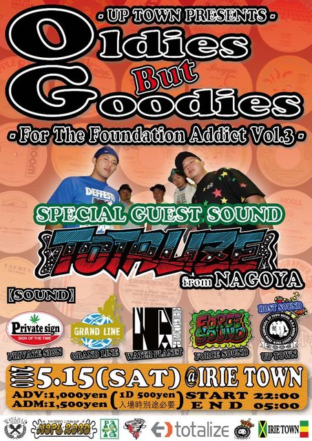 SKAやROOTS、ROCK STEADY、EARLY REGGAE、80's & 90's DANCEHALLが好きで好きでたまらない人のために、南大阪泉州地区で活動するUP TOWNがお贈りするレギュラーダンス「Oldies But Goodies」の第3弾 開催は奇数月を予定し、さらに毎回FOUNDATION REGGAEを得意とするSOUNDをSPECIAL GUESTに迎えてお贈りします 開催場所は、堺市・深井にあるレゲエバー「IRIE TOWN」。 南大阪では随一の本格SOUND SYSTEMが完備されておりますのでぜひブリブリのベースラインを感じてみてください 最寄駅は泉北高速鉄道「深井駅」から
