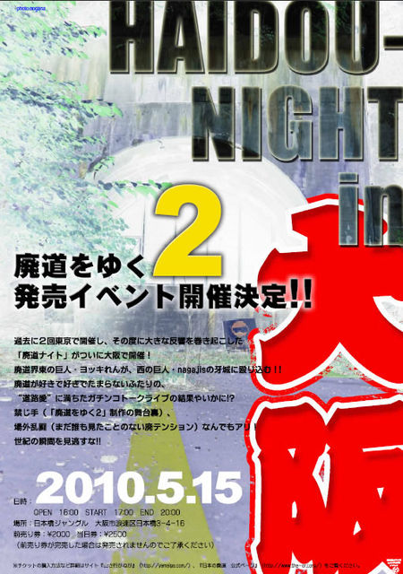 5/15(土) 『廃道ナイト! in大阪』 前売りチケットお求め: http://eplus.jp/sys/T1U14P0010843P0100P002040448P0050001P006001P0030001 【開場】16:00 【開演】17:00 【終了】20:00予定 at 大阪 JUNGLE (日本橋) 出演: ヨッキれん & nagajis ■■予定される内容 [第一部] ◆(廃)道をテーマとした新表現展覧会(仮) (今回のひとつのメインであると考えております。詳細は後述します。このコーナーの主役は皆様です。道を愛する皆様が主役です! 皆様の作品を募集します。