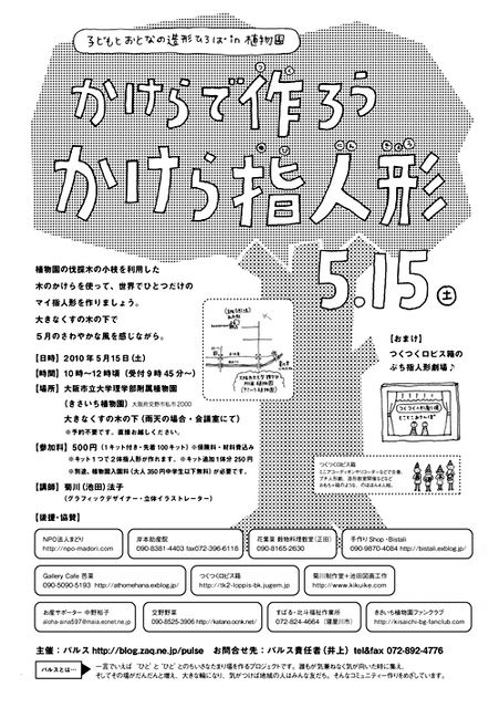 〜子どもとおとなの造形ひろば〜 植物園伐採木の小枝を利用した 木のかけらをつかって、世界でひとつだけの マイ指人形をつくりましょう。 大きなくすの木下で 5月のさわやかな風をかんじながら。 日時・2010年5月15日(土)午前10時〜12時頃 場所・きさいち植物園(大阪市立大学理学部附属植物園) 大阪府交野市私市2000 おおきなくすの木の下(雨天の場合、会議室にて) 受付・午前9時45分〜(事前の申込みは不要です) 参加費・500円(1キット付き 先着100キット) ※保険料・材料費込み