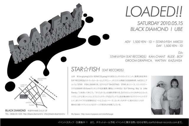 2010 5 15(SAT)21:00〜 LOADED!! @BLACK DIAMOND 「http://black-diamond.tv/ 」 ADV1500YEN 1D+(STAR☆FISH MIXCD) DAY1500YEN 1D house/rock’n-beats/hiphop/R&B/reggae/electro...and limited tunes!! Djs STAR☆FISH(EAT RECORDS)、KAN-CHANT、RUDE−BOY、GROOM GRAPHICA WATTAN、KAZUHISA ,honekawa メッセージ送ってくれれば前売りMIXCD準備出来ます