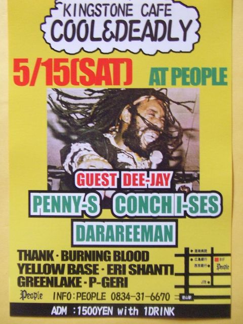 _____________<<KING†STONE CAFE 〜COOL&DEADLY〜VOL.3>>____________ 5月15日(土曜日) @People(周南市) ADMISSION 1500円+1d 21:00 OPEN ___ GUEST DeeJay___ PENNIE-S DALAREE MAN CONCH I-SES 〜マイクを握ったら離さない!しゃべくりラバダブスタイルDeeJayが登場! 南米の旅から帰って来たCONCH I-SES!! フロアを湧か