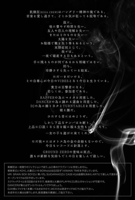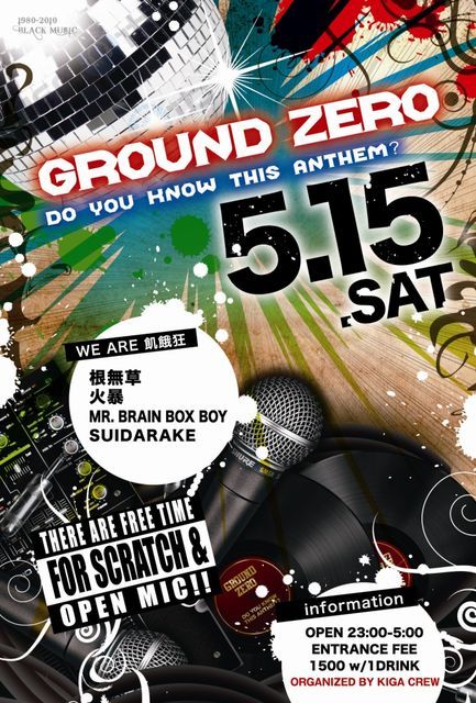 出演者4名オンリー。 5.15.SATにBBBで開催。 ■GROUND ZERO■ ex/原点 エントランスはチケットレスでALL 1500(1DRINKコミコミ)。 主催は根無草。 *CAST* 根無草 火暴 SUIDARAKE MR. BRAIN BOX BOY 日頃のイベントでは。 減点回避バッカ考えちゃって。 ソレ面白く無いナァってブッチャケ。 主催者が思っちゃったら… ダメヤロ!! そんな自分にブチ当たったから。 原点回帰。 CLUBや音楽を出演者がフルに楽しむ。 コレでCLUBERとマジでキモチをヒトツにし