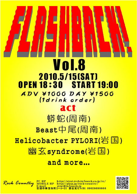 FLASHBACK vol.8 OPEN 18:30 START 19:00 adv 1000円 day 1500円(1dr オーダー) act ☆蟒蛇(周南) ☆Beast中尾(周南) ☆Helicobacter PYLORI(岩国) ☆幽玄syndrome(岩国)