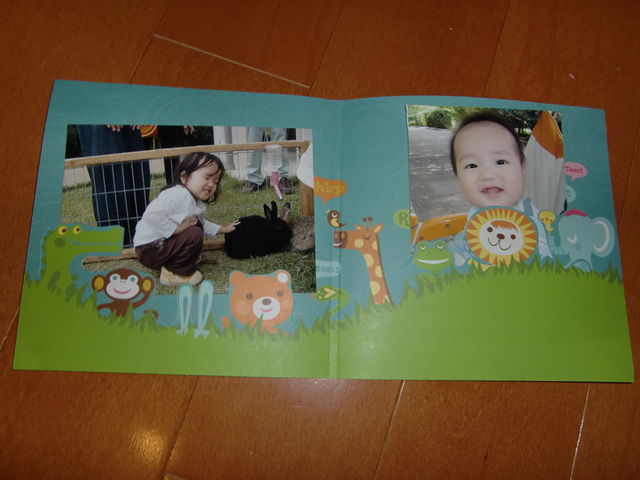 5月はGWでおでかけ多いだろうな〜と思うので かわいい動物柄の飾れるフォトスタンドです。 おそらく国内で販売していないペーパーで、 先月アメリカから取り寄せたばっかりのフレッシュなペーパーを使って作ります 動物園・牧場の写真はもちろん、子供たちが野原で元気に走り回ってる写真なんかもよく合います。 大きさは約6インチ×6インチ(15センチ×15センチ)です。 表紙をめくったところに1枚、中に2枚貼れます。 写真は差し替え可能ですので、お気に入りの写真を定期的に取り換えて楽しむことができます。 裏表紙に
