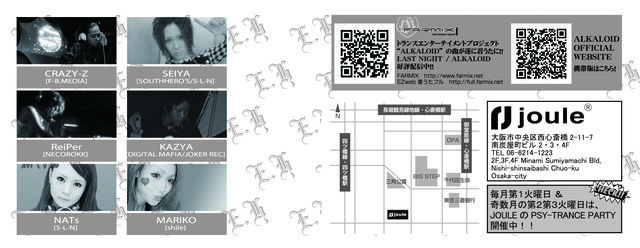 ■DAY:2010/5/18(Tue) PSY-TRANCE PARTY!! [Electro Harmonix -ALL BACK2BACK STYLE-] ■PLACE:心斎橋 club JOULE ■料金:MAN:2000円(1D) / WOMAN:1500円(1D) ■TIME:23:00-5:00 iFLYER(割引クーポンあり) http://iflyer.tv/event/59301/Electro-Harmonix/ ■DJs CRAZY-Z(F-B.MEDIA) SEIYA (SOUTHHERO'S/S-L-N) NECO1 (NECOROKK) ReiPer (NECOROKK) KAZYA (DIGITAL MAFIA/JOKER REC) NATs(S-L-N) MARIKO(shile) ■clubJOULE 大阪市中央区西心斎橋2-11-7 南炭屋町ビル 2・3・4F 2F,3F,4F Minami Sumiyamachi Bld, Nis