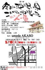 向井千惠の主宰する即興表現ワークショップ。関西50回目の開催です。 音楽・舞踏・パフォーマンス・身体表現・美術・詩・映像etc。 大阪中崎町の 「Common Cafe」での開催です。 みなさまお気軽にいらしてください。 □ 2010年5月18日(火)「即興表現WORKSHOP #50」 音楽・身体表現・美術・詩・映像・パフォーマンス・その他あらゆる表現行為 企画・参加:向井千恵ほか 大阪中崎町 Common Cafe 地下鉄谷町線中崎町駅4番出口徒歩1分 大阪市北区中崎西1-1-6 吉村ビルB1F http://www.talkin-about.com/cafe/map.html 18:30open