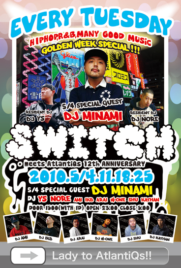 管理人様告知失礼致します。不適切なら削除下さい。 貴重なスペース失礼します。 4月から新たに始まったHIP HOP,R&B PARTY!!「SWITCH」 毎週火曜日に@AtlantiQsで開催されており、最新の曲はもちろん 新旧問わずHIP HOP,R&Bを中心に レギュラーDJ陣がナイスな選曲、 PLAYでヤバイ夜をさらに盛り上げます!! 年齢問わず、クラブ初心者の方はもちろん パーティー好きな方や クラブによく行く方も 楽しめる内容になっています!! 早い時間はゆったりとした空間でお酒を飲みながら 音楽を聴きBAR感覚も味わえます♪ もちろん、テキーラ解放