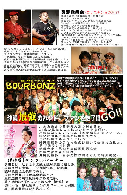 5月18日(火)イベント告知用の動画を作成しました。 携帯からでもご確認出来ます。 ※下↓のURLからご確認下さい…。 http://mixi.jp/view_diary.pl?id=1462713971&owner_id=11589363 楽曲、映像は今回のイベント出演者となってます こちらは出演者や会場案内用の紹介URL↓ http://mixi.jp/show_friend.pl?id=11589363 僕のプロフィールからご確認下さい おかげ様で 島唄ライブ琉球は 3周年を 迎える事が出来ました〃 3周年を迎えた今、 当店主催でイベントを店ではなく