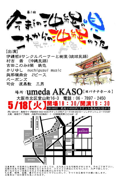 管理人様、不適切でしたら削除下さい…。 5月18日(火)イベント告知用の動画を作成しました。 携帯からでもご確認出来ます。 ※下↓のURLからご確認下さい…。 楽曲、映像は今回のイベント出演者となってます こちらは出演者や会場案内用の紹介URL↓ http://mixi.jp/show_profile.pl?id=11589363&from=navi 『情報は発信』 おかげ様で 島唄ライブ琉球は 3周年を 迎える事が出来ました〃 3周年を迎えた今、 当店主催でイベントを店ではなく umeda A