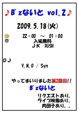 B'z ないと vol2 2010.05.18(火) :22:00-01:00 :入場無料 :JK RUSH DJ Y.N.O/Syn 前回大好評の為にリクエスト やってまいりました第二回目B'zないと この日は新旧問わずB'zの音楽が流れまくります リクエストあり ライブDVDあり 肉団子あり