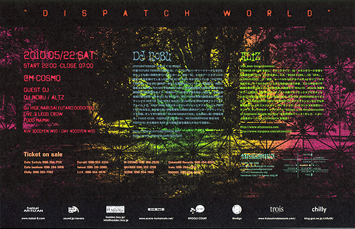 今回のディスパッチは、全国パーティーシーンで絶大な人気を誇る二人が登場!この4月に、現代のParadise Garageこと。ドイツBERGHAINにて、日本人では初めてとなるDJを披露し。更に勢いの増すNOBU。そして、全国に名を馳せるFlower of LifeよりALTZ!今回が待望の熊本初登場!