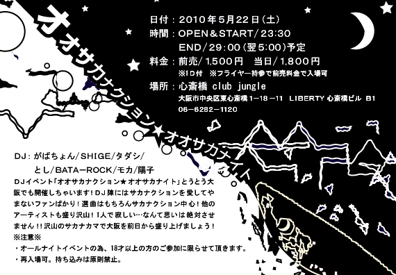 管理人様、告知スペースお借り致します。 日付:2010年5月22日(土) 時間:OPEN&START/23:30 END/29:00(翌5:00)予定 料金:ADV/1,500円 DOOR/1,800円 ※1ドリンク付 場所:心斎橋 club jungle(http://www.clubjungle.jp/) 住所/大阪市中央区東心斎橋1-18-11 LIBERTY 心斎橋ビル B1 TEL/06-6282-1120 アクセス/ 大阪市営地下鉄御堂筋線「心斎橋駅」6番出口を出て、東向きに歩き、左手に中華料理の「大成閣」が見えるまで直進(ドコモショップとメガネの三城の間を直進)。 「大成閣」の東隣のビルで備長炭焼き鳥居酒屋「SASAYA」イ