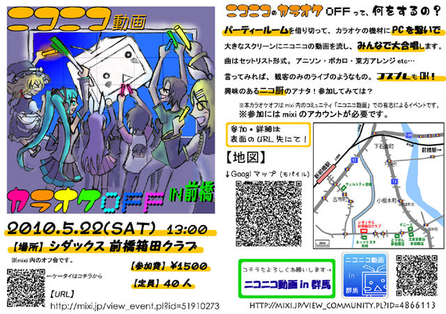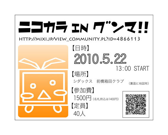 初めまして、半分幹事のPOSTALと申します。 群馬から、OFFが無いよーと悲鳴が聞こえた気がするので 是非、開催していこうと思います! ※でも、幹事未経験。助けてー(悲鳴 初回ということもあり、「初心者でも入りやすく!」をコンセプトに 構成を考えていますので宜しくお願いします 壁があるなら殴って壊す、 道がなければこの手で創る! みんな、熱くなれよぉ!ヽ(`Д´)ノ ◆開催日時◆ 5月22日(土曜日)13:00〜18:00 ◆開催場所◆ カラオケ SHIDAX 前橋箱田クラブ(※下記リンク参照) ※JR上越線 新前橋駅