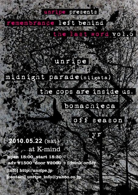º£·î 5/22(ÅÚ) ¤Ëunripe´ë²è "remembrance left behind the last word vol.6" ¤ò¹Ô¤¤¤Þ¤¹¡£6²óÌܤȤʤ뺣²ó¤ÏÅìµþ¤Î SAY HELLO TO NEVER RECORDINGS ¤«¤éunripe¤È¤Îsplit¤ò¥ê¥ê¡¼¥¹¤·¤¿¿·³ã¤Î¡Ömidnight parade¡×¤ò¾·¤¤