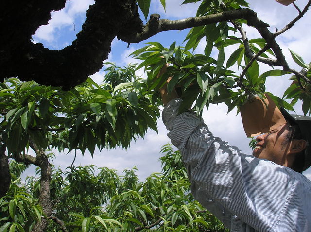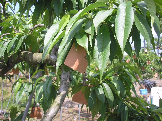 「桃の袋かけ体験」 桃の実が梅の大きさになる頃、一つづつ丁寧に 袋かけをします。 虫や病気や太陽の直射日光から守るためです それだけ、桃はデリケートなんですね 袋は100枚単位で輪ゴムで止めてあります。 1本の木に何枚袋がかけられると思いますか 大きな木だと500枚ほど袋をつけます。 桃の袋かけが終わればいよいよ桃の収穫まで待つのみ 体験日時:2010年5月22日(土曜日)です。 体験時間:約6時間 体験参加費:大人(中学生以上)2500円 子供(小学生)1000円 園児3歳〜小学生