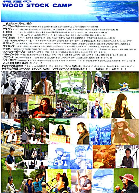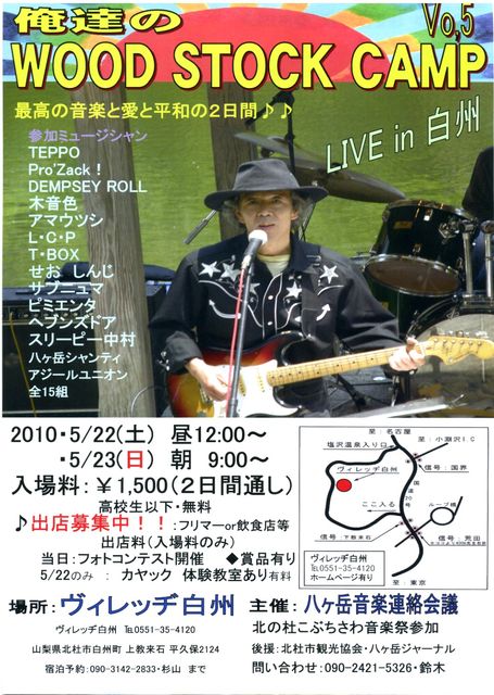 最高の音楽と愛と平和の2日間〜♪ 参加バンド 全15組 ♪日 時 2010年5月22日(土)昼12時から 23日(日)朝9時から ♪入場料 1500円(2日間通し) 高校生以下無料 ♪会 場 ヴィレッジ白州 0551−35−4120 北杜市白州町上教来石平久保2124 http://homepage2.nifty.com/village_hakushu/ ♪内 容 全15組のバンドによるライブ演奏 フリマ 飲食出店 カヤック体験教室(22日のみ・有料) 宿泊もOK→予約