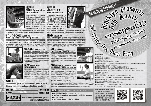 ★★★響家 音泉祭 22FREE DANCE PARTY ★★★ hibikiya presents 5th anniv onsensai22 mid spring free dance party 最高のDJで開催されるhibikiya onsensai 22 TRANCE,TECHNO,CILLOUT,ElectroHouse,MUSIC & LIVEPAINTING -Date/Place- 05/23 sun 2010 saitama misato edogawa nagareyamabasi 下流 http://www.mapion.co.jp/here/all/100515/mapi0121898100515173931.html -ACCESS- 最寄り駅・・・JRmusasinoline misatostation tukubaeEXPRESSline misatochuou misatostation より・・・徒歩10分〜15分 misa