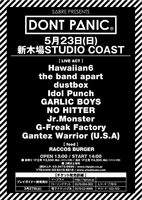 告知失礼します。 5月23日(日) 新木場スタジオコーストにてアメリカ・ニューポートビーチ発でサングラスなどを展開するブランドSABRE(セイバー)によるイベント「DON'T PANIC」が行なわれます。 dustboxを始めとした出演バンドはもちろん、会場内にスケートランプなども置かれる予定で、SABREの世界感を味わうことの出来るイベントになりそうです。話題のハンバーガーショップ Raccos Burgerも出店しますので、こちらもお見逃し無く。 前売り特典も有! 出演バンド: dustbox Hawaiian6 the band apart Idol Punch