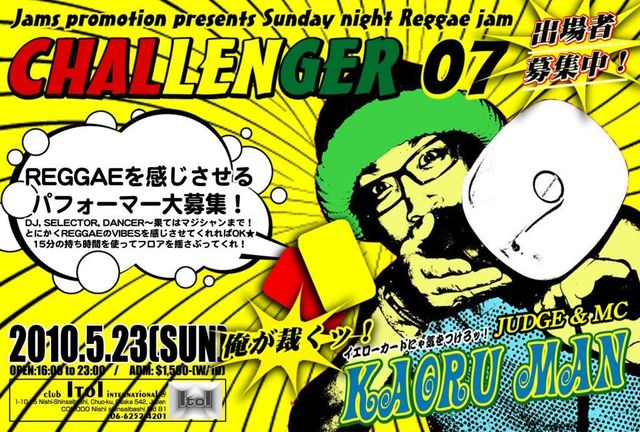 DJ出場者募集型レゲエエンターテイメント ぴかぴか(新しい)チャレンジャーぴかぴか(新しい) ★入場料金 ¥1500円(with1drink) ※チャレンジャー参加のDJも参加料としていただきます。 ★参加者は(チャレンジャー)参加費を支払ってから、参加申込書にプロフィールを記入してもらい、参加順に1プレー15分を厳守して、プレーしてもらいます。 尚、営業時間や、その時の参加人数しだいで、もう1プレー出来る事があります。 ※ 逆に人数参加多数の時や、営業時間終了の場合は一度きりのプレーの時もあります。 レギュラーDJ: ・