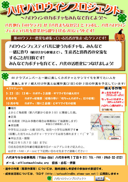 こんにちは! 今度、八代で新しい取り組みが始まります電球 もし宜しければご参加くださいませ! 受付は私もしておりますーほっとした顔 直接メッセージでもお問い合わせくださいませ! ※ハロウィンプロジェクトは10月に行われる「八代ハロウィンフェスタ」に向けたいろいろな取り組みの総称です。 まだまだいろいろなことを仕掛けていきますのでお楽しみに♪ ▼以下、転載☆ http://yatsushiro4hc.otemo-yan.net/e300365.html 【八代ハロウィンプロジェクト】 やっちろ4HC広報部です☆ この度八代4HCは、八代の