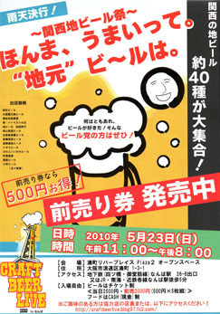 我が「榮」コミュとリンクしてます、私が副管理人してます「音楽&グルメが好きな人コミュ」http://mixi.jp/view_community.pl?id=3768479のイベントを我がコミュでも参加したいと思います。指でOK  日曜休みですし。ビール好きには、かなりたまらな〜いイベントです指でOK [日時] 2010.5.23(日曜日) 午前11時〜午後8:00 [場所] 港町リバープレイス Plaza2 オープンスペース [アクセス] 地下鉄なんば駅 26-B出口、       JR・近鉄・南海なんば駅より徒歩5分 [入場] 入場自由! ビールはチケット制(当日2,500円 前売2,000円)
