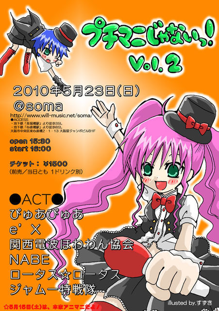 ライブ告知です! -プチマニじゃない!vol2- ■日時  2010/05/23(日) -open 15:30 -start 16:00 チケット: \1500 (前売/当日とも 1ドリンク別) ■会場 心斎橋 soma http://www.will-music.net/soma/ ■ACCESS ・地下鉄堺筋線/長堀鶴見緑地線「長堀橋駅」より徒歩3分。 ・地下鉄御堂筋線/長堀鶴見緑地線「心斎橋駅」より徒歩8分。 〒542‐0083 大阪市中央区東心斎橋2‐1‐13 大阪屋ジャンボビルB1F ■出演バンド ・ぴゅあぴゅあ ・e’X ・関西電波ほわわん協会 ・NABE ・ロータス☆ロータス ・ジ