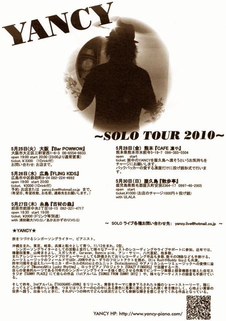 もう間近とはなりましたが, 6日間にわたるYANCYソロツアーが25日からはじまります。 初夏の心地よい風と共に、YANCY WORLDへTRIPしにお越しください。 詳細は下記となります。 どうぞよろしくお願いいたします☆〜 5月25日(火) 大阪 『Bar POWWOW』 大阪市大正区三軒家西1-6-3 06-6554-8833 open 19:00 start 20:00 (23:00より通常営業) ticket.¥3300 (1Drink付) お問い合わせ: お店まで。 5月26日(水) 広島 『FLYING KIDS』 広島市中区鉄砲町8-24 082-224-4692 open 19:00 start 20:00 ticket. \3000