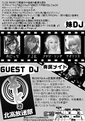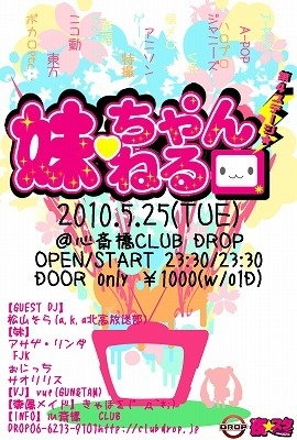 CLUB DROPにて開催中の脅威の動員を誇るサブカルイベント『夜☆スタ』から【妹】たちが飛び出したぁ?!!キタ━━━━(゜∀゜)━━━━!! とっても乙女でキュートな女の子が、J-POP/A-POP/ハロプロ/ジャニーズ/V系/懐メロ/アニソン/ゲーソン/特撮/童謡/キャラソン /ニコ動 /東方/ボカロetc‥等々幅広い音楽をドーンと流しちゃぅDJパーティー★ DJそれぞれの個性溢れる選曲と未知なる空間に、ぁなたもきっと目が離せなくなること間違いなし! コスプレ参加も大歓迎★(更衣室と撮影スペースも完備 ♪) 一緒に歌って踊って楽しんぢゃぉっ♪ 妹ちゃ