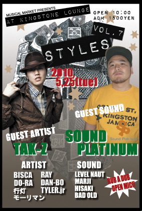 管理人様告知失礼します。 5/25(火)KINGSTONE LOUNGEにてSTYLES!! STYLES VOL.7 ADM1500YEN GUEST ARTIST TAK-Z GUEST SOUND SOUND PLATINUM SOUND LEVEL NAUT SOUND MARJI HISAKI ARTIST bisca DO-RA 行灯 RAY DAN-BO TYLER.jr モーリマン RUB A DUB OPEN MIC!!!