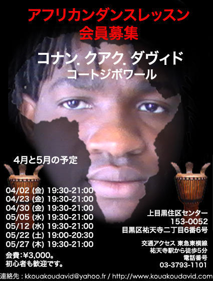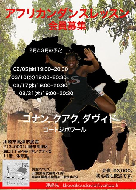 こんにちは、三好東曜です。 友人の素晴らしいダンサーがクラスを始めるので 告知をさせて下さい。4月以降のクラスに僕はサポートドラムと通訳で 参加する予定です。 _________________________ 日本で唯一のコートジボワールのダンスを学べます! (テマテ、ザウリ、ンゴロン、アバンダン等) レベルに併せてコートジボワールのダンスを中心に アフリカンダンスを丁寧に教えていきます。 先生はコナン・クゥアク・ダヴィッド先生 とっても優しい空気を醸し出しているナイスガイです。 http:/