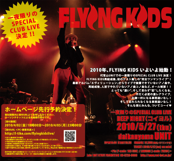 2010年、FLYING KIDS いよいよ始動! 代官山UNITでの一夜限りのSPECIAL CLUB LIVE決定! FLYING KIDS再結成後、初のゲスト無しの”完全ワンマンライブ”! 最新アルバム「エヴォリューション」からライブで披露できていないアノ曲や、 再結成後、人前でやれていないアノ曲コノ曲など、オール解禁!! とっても”濃い”、そして思わず”恋”したくなる、 汗だく必死の激レアライブ。 お腹一杯なる事間違いなし! そして忘れられなくなる事間違いなし! そんな夜にみんな、ついてコーイ❤