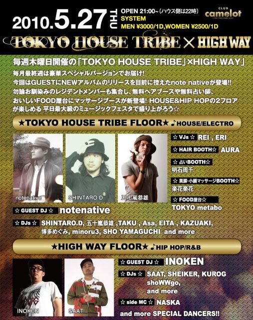毎週木曜日開催の「TOKYO HOUSE TRIBE×HIGH WAY」 平日最大級2フロア 毎月最終週は豪華スペシャルバージョンでお届け 今回はGUESTにNEWアルバムのリリースを目前に控えたnote nativeが登場 勿論お馴染みのレジデントメンバーも集合し、無料ヘアブースや無料占い師、おいしいFOOD屋台にマッサージブースが新登場 HOUSE&HIP HOPの2フロアが楽しめる平日最大級のミュージックフェスタで盛り上がろう mixi特典としてDiscountサービスを行っていますので、ぜひともご利用ください TO