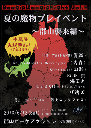 お疲れ様です!告知失礼致します! なんと!青森で毎年ロックの歴史を塗り替えているもはや伝説的なイベント『夏の魔物』のプレイベントを郡山で行うことになりました!!! 青森から、山形から、そして地元郡山から、アツイメンツが揃いました。 この対バンは後にも先にも今回だけになると思います。 サイコーに楽しく、アツイ夜になるので、是非遊びにいらしてください! また、中高生は入場無料です。 是非あなたの周りの中高生を道連れにしてくださいw 行けるよ〜って方はメッセください! 打ち上げだけの参加も大歓迎です