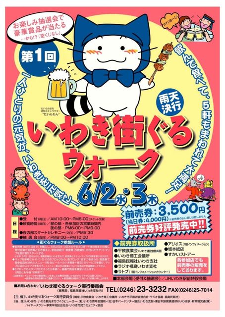 今日と明日は、いわきの飲食店を¥3.500のチケットで5軒回れるお得なイベントです! 今日から2日間 【6/2(水)・3(木)】 いわき駅周辺の飲食店を会場として、 美味しくて楽しいイベントが開催されます! お客様にとっては、とってもお得な二日間です。 3,500円のチケットで5軒回れますので 1軒700円のご予算で、各店の気合の入ったサービスメニューが頂けます。 引き換えたチケットに各店のメニューが載っています。 ルールはいたって簡単。 ●6月2日(水)・3日(木)の午前10時〜午後8時までの間に 受付会場(いわき駅前ミス
