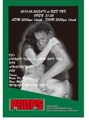 PROPS 6/26(SAT) 21:30〜 HIPHOP REGGAE R&B ADM 2000 1D DOOR 2500 1D TICKET INFO 'susurimania@softbank.ne.jp' http://www.redink.jp/i/index.html DJ CHUCK-TEEakaMM-HOT-T KIX ANACHEMIST JOE DANCE Beats Da runker HOST MC MIYAZY MASTR FLEX WUZ GOOOD???BOY&GIRL??? 六月もやっちゃいます。梅雨模様もふっ飛ばしちゃいますPROPS!! 最新のHIPHOPからRB、REGGAE、SOUL、FUNK までこのPARTYでしか聴けない世界のグットミュージッ