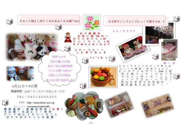 6月のイベントが決定しました。 大きく2つ 手作りハンドメイド・にっこり展Vol.5 &ぎゅっと抱きしめたくなるあみぐるみ展Vol.2 として、2つ同時開催です。 開催場所:旅館岩沢荘と☆Mamashops☆の2箇所 旅館のほうは、大広間にて、あみぐるみ展 お店のほうは、布小物のハンドメイドなどの展示販売です。 開催日時:6月11日(金曜日)から3日間 開催時間:AM:9:00~PM:19:00 参加希望者の方は、下記のイベント専用HPよりお申し込みください。 追って、正式申込のメールとパスをお送りします。