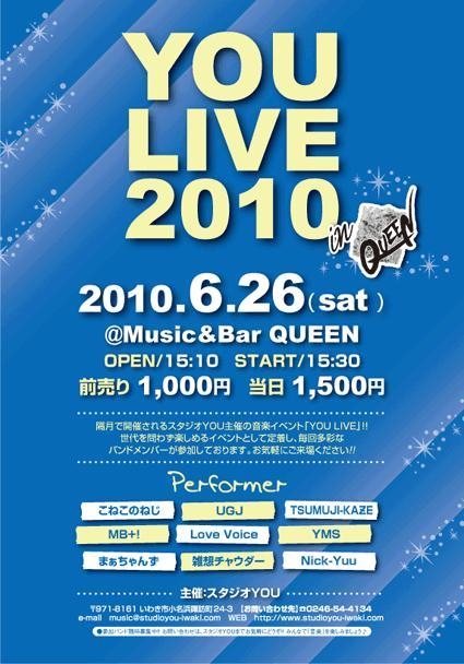 小名浜のスタジオYOUさん主催の 隔月で開催される音楽イベント「YOU LIVE」です。 ■YOU LIVE 2010 in Music&Bar QUEEN ■日時:2010年6月26日(土) ■時間:OPEN 15:10 START 15:30 ■料金:前売り 1,000円 当日 1,500円 ■場所:Music&Bar QUEEN いわき市平字白銀町9-1 グランパークホテルエクセルいわきB1 TEL.0246-21-4128 ■チケット:前売り 1,000円(税込)、当日 1,500円(税込) ★出演バンド★ こねこのねじ UGJ TSUMUJI-KAZE MB+! Love Voice YMS まぁちゃんず 雑想チャウダー Nick-Yuu ■ご予約はこちら