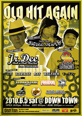 2010年 6月5日 土曜日 DOWN TOWN & FLAVA JUSTICE主催 ♪♪OLD HIT AGAIN♪♪ @DOWN TOWN 大阪府泉大津市若宮町10-7 TEL.0725-27-0400 DOWN TOWN WEB ↓↓↓↓↓↓ http://www.downtown-web.net OPEN 22:00-5:00 ADV.1500yen+1D ADM.2000yen+1D 【GUEST DEEJAY】 Jr.Dee from.Yokohama http://m.mixi.jp/view_community.pl?id=198892& NATURAL WEAPON http://m.mixi.jp/view_community.pl?id=2336474& 【GUEST SOUND】 SOUND PLATINUM http://m.mixi.jp/view_community.pl?id=280339& 【DEEJAY】 行灯 KAWMAN RAY WALTHER モーリマン
