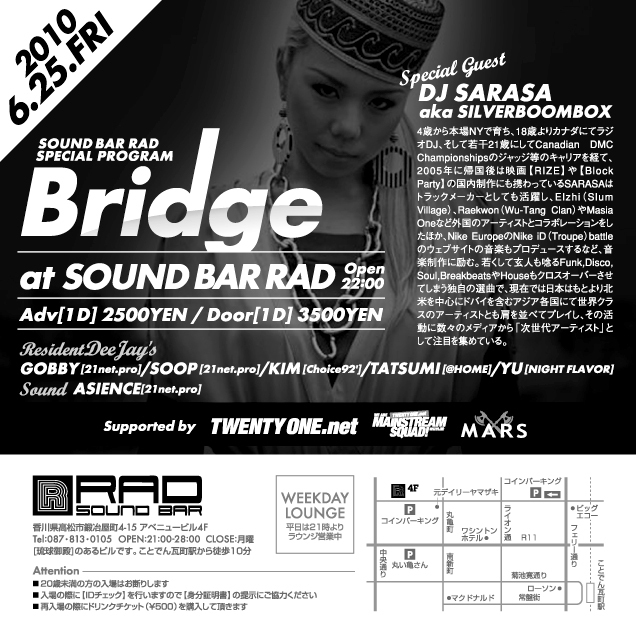 ※このBRIDGEは0時までに入場の女性に限り入場無料です(別途1D¥500のみ購入して下さい) 岡山と高松を結ぶイベントBRIDGE!! 記念すべき第一回目はDJ SARASA!!現在国内はもとより海外でもDJしている彼女とBRIDGEをかけちゃいます!! GENRE : HIPHOP 2010/6/25(Fri) @SOUND BAR RAD OPEN : 22:00 ADV : 2500YEN-1D DOOR : 3500YEN-1D SPECIAL GUEST : DJ SARASA aka SILVERBOOMBOX RESIDENT DJ : GOBBY(21net.pro) / SOOP(21net.pro) / ASIENCE(21net.pro) / KIM(Choice92') / TATSUMI(@HOME) / YU(NIGHT FLAVOR) ■DJ SAR