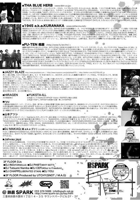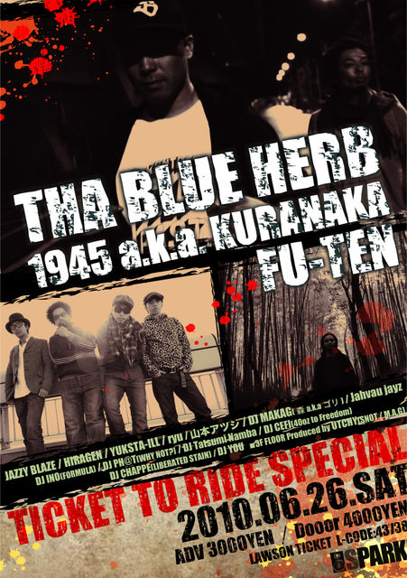 管理人様、告知失礼致します。 6月26日土曜日に三重県鈴鹿SPARKにて、 FU-TEN DJ SUWA presents"TICKET TO RIDE"があります! 今回はTHA BLUE HERBをゲストに迎えます! 必見、必聴!お見逃しなく、是非遊びに来てください!! 以下詳細です! TICKET TO RIDE SPECIAL 2010.6.26(SAT) ADV \3000 / DAY \4000 OPEN/START 22:00 ローソンコード L-CODE 43738 出演者 THA BLUE HARB / 1945 a.k.a KURANAKA / FU-TEN DJ RYU / 山本アツシ / MAKAG / Jahvau Jayz MC JAZZY BLAZE / YUKSTA-ILL / HIRAGEN