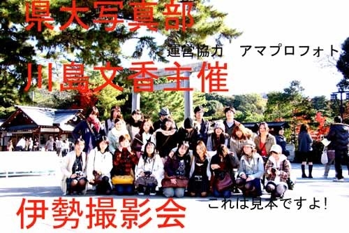 個々の掲示板でどんどん更新していきます! 久しぶりのバスツアーです。 今回は、元当店アルバイト従業員、 愛知県立大学写真部・川島フミカ氏の後輩による、撮影会です。 予定;名古屋出発⇒お伊勢さん、おかげ横丁(写真撮るにはいいかも、寂れた商店街も行く予定)⇒蔵のある街並み河崎町⇒名古屋帰着(19;