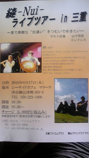 ・ サニーサイドでお馴染みの 松園 さとし君が活動しているユニットの一つ〜縫〜 〜音で素敵な 出逢い をつむいでゆきたい〜 そんな 想いで 活動を続けている ユニットです 今回 ゴールが 大阪! 関西ライブツアーをしたい!と 6/16 奈良をかわきりに ライブをしていきます 三重県での開催も決定し ポスター チケットも完成しました ☆ 2010年 6月 17日 木曜日 ☆ シーサイドカフェ マリーナ 津市柳山津興(ヨットハーバー) ☆ 開場 18:30 開演 19: