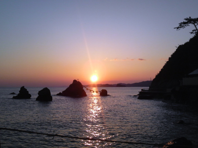 夏至とは、一年中で一番昼が長く夜が短い日です。 古来より、天照大神は太陽の化身と位置づけされていました。 この太陽の力が一番強い(日照時間が長い)この日に、太陽の生命力を得るために 夏至の日を一緒に祝うお祭りを行います。 世界の各地でも同様なお祭りが、行われますが 日本古来の神事に則り、二見興玉神社で禊(みそぎ)行をし この日前後だけに見られる 夫婦岩の中心、富士山の背より登る朝日を浴び 伊勢神宮 天照大神への参拝をします。 太陽の力、全てを慈しみ育てるエネルギーを一緒に感じ 深刻ではない真剣さ、怠