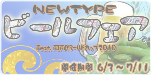 晴れ今年の6月は、4年に一度のサッカーの祭典、 ワールドカップ2010の開催月間! NEWTYPEもそれに乗っかってしまえ! ってことでいろんなキャンペーンをぶち込んだ 【NEWTYPEビールビールフェアビール】を開催しちゃいます! ハートキャンペーン期間ハート  2010年6月3日(木)〜7月11日(日) スペードワールドビールフェアスペード  ワールドカップを見るならやっぱりビールビールでしょ!  ってことで世界中の有名な美味しいビールビールを集めちゃいました!  そしてビール生ビールの飲み放題ビールまでやってのけちゃうのだ☆