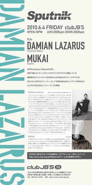 告知失礼します。 実力派DJとして今もっとも評価されている、DAMIAN LAZARUS (ダミアン・ラザラス)が3年ぶりに来名 ●6/4 (金) 10PM @ CLUB JB'S Sputnik DAMIAN LAZARUS DJ: DAMIAN LAZARUS (Crosstown Rebels) MUKAI (Sputnik) ADV.2500yen, DOOR 3000yen [ 問合せ先 ] オフィシャルサイトURL: CLUB JB'S (http://www.club-jbs.jp/) お問い合わせ:052-241-2234 名門Crosstown Rebelsを主宰し、世界で最もカッティングエッジなサウンドをフロアに供給している 越境系天才クリエイ